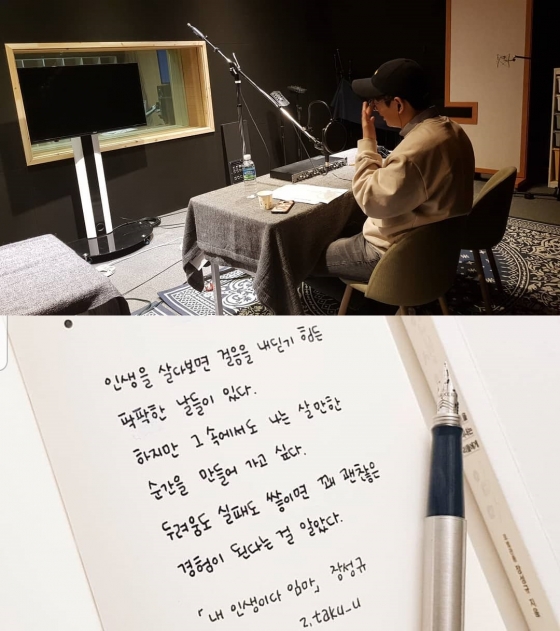 공개된 사진 속 장성규는 책 '내 인생이다 임마'를 녹음하고 있다. 특히 책 일부 문단을 직접 종이에 적어 반듯한 필체를 공개해 시선을 끌었다.