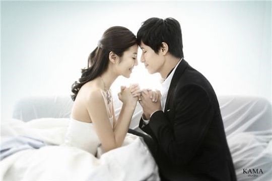 공개된 사진은 신랑 정조국과 함께 찍은 웨딩 화보다. 둘은 기도하는 손모양을 만들고 서로 얼굴을 맞댄 채 웃고 있어 훈훈함을 보여줬다.