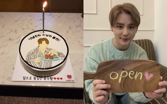 공개된 사진 속 케이크에는 김준수의 그림과 함께 '10년 만의 지상파 출연! 앞으로 꽃길만 준수형♥'이라는 글이 적혀있다.