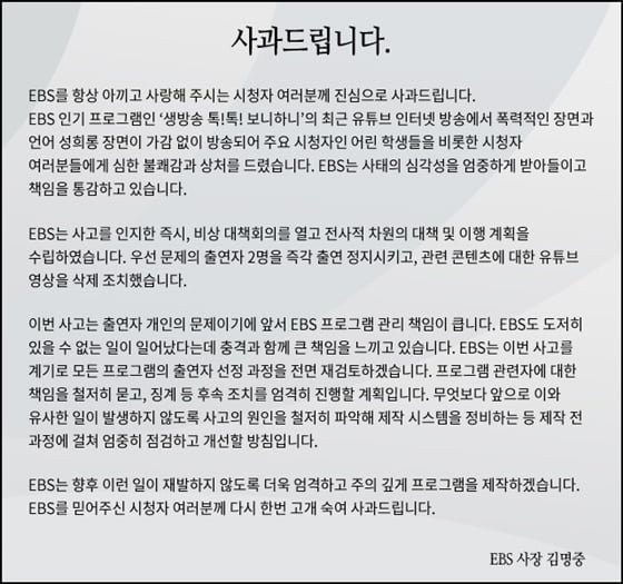 이에 EBS는 결국 '보니하니' 공식 홈페이지, 인스타그램 등을 통해 사과 입장문을 발표했다. EBS(사장 김명중)는 "EBS 인기 프로그램인 '생방속 톡!톡! 보니하니'의 최근 유튜브 인터넷 방송에서 폭력적인 장면과 언어 성희롱 장면이 가감 없이 방송되어 주요 시청자인 어린 학생들을 비롯한 시청자 여러분들에게 심한 불쾌감과 상처를 드렸습니다. EBS는 사태의 심각성을 엄중하게 받아들이고 책임을 통감하고 있습니다"고 전했다.