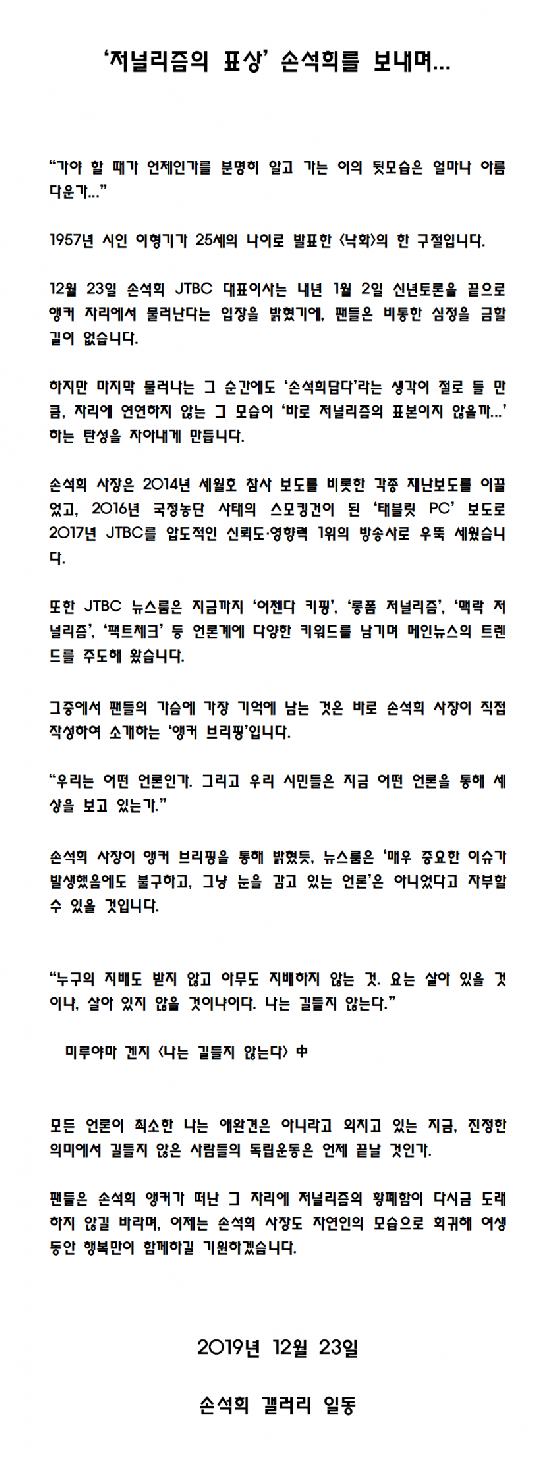 이와 함께 "모든 언론이 최소한 나는 애완견은 아니라고 외치고 있는 지금, 진정한 의미에서 길들지 않은 사람들의 독립운동은 언제 끝날 것인가. 팬들은 손석희 앵커가 떠난 그 자리에 저널리즘의 황폐함이 다시금 도래하지 않길 바라며, 이제는 손석희 사장도 자연인의 모습으로 회귀해 여생 동안 행복만이 함께하길 기원하겠다"고 덧붙였다.