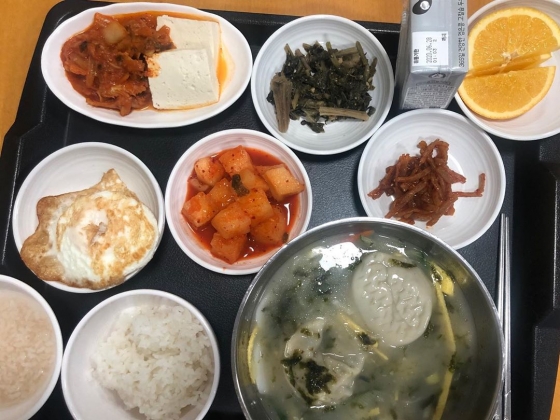 김영철이 공개한 사진은 특식으로 나온 아침 식사 메뉴로, 김영철의 말대로 만두 2개가 들어가 있다.