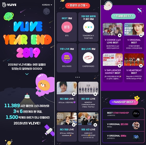 브이라이브 측은 "올 한해 브이라이브와 함께 해주신 수많은 스타와 팬 여러분께 진심으로 감사를 드린다. 그 어느 때보다 다양한 분야에서 새롭고 의미 있는 데이터 수치가 나온 것 같다. 2020년 경자년에도 독보적인 기술과 시스템으로 스타와 팬의 글로벌 커뮤니티 플랫폼을 만들어 나가겠다"고 전했다.