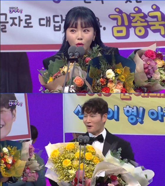 홍진영과 김종국이 '2019 SBS 연예대상'에서 최우수상을 받았다.