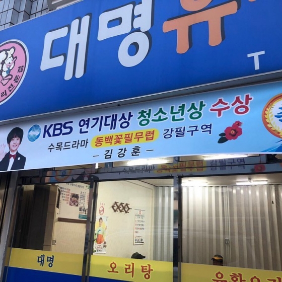 공개된 사진 속에는 가게 간판 아래에 설치된 현수막이 있다. 현수막에는 'KBS 연기대상 청소년 상 수상 수목드라마 동백꽃 필 무렵 강필구역 김강훈'이라고 적혀있다.