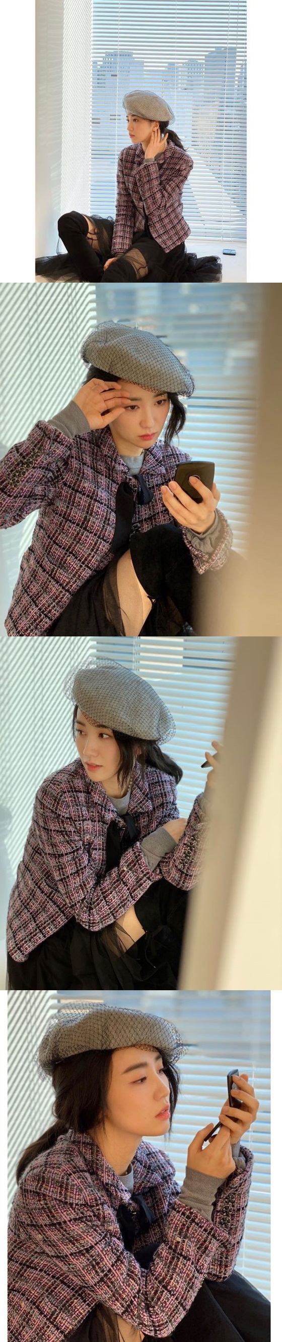 공개된 사진 속 박하선은 망사로 덮힌 회색 베레모와 분홍색 체크무늬 재킷으로 요조 숙녀 같은 스타일을 완성했다. 그녀는 상의는 정갈하게 차려입은 반면, 하의는 허벅지를 노출시킨 스커트 패션으로 반전을 안겼다.
