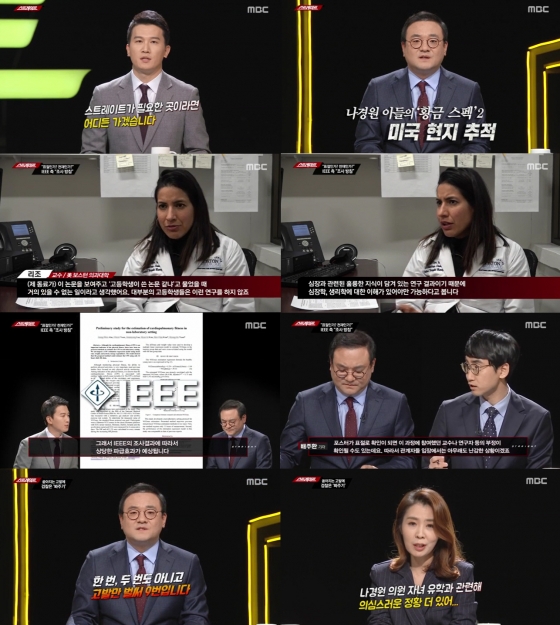 '스트레이트'는 방송에서 지난 2019년 11월 18일 방송됐던 '나경원 아들 황금 스펙' 2탄을 방송했다. 제작진이 미국 현지 취재를 통해 의혹의 실체를 추적한 끝에, 지난 방송에서 제기한 나 의원 아들의 학술 포스터 표절 및 저자 자격 등의 의혹을 집중 보도한 것.