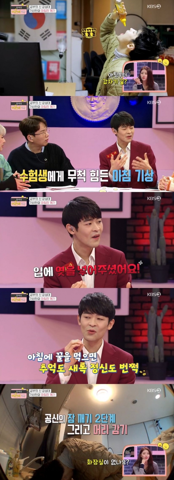이어서 강성태가 한 것은 바로 꿀 마시는 것. 강성태의 아침 꿀 드링킹은 모두의 눈을 의심케 했다. 강성태는 "학생들이 아침에 일어나려면 힘들지 않나. 근데 저는 어렸을 때 어머니께서 입에 엿을 넣어주셨다. 달콤한 게 입에 들어오면 잠이 깬다"면서 웃음을 터뜨렸다.