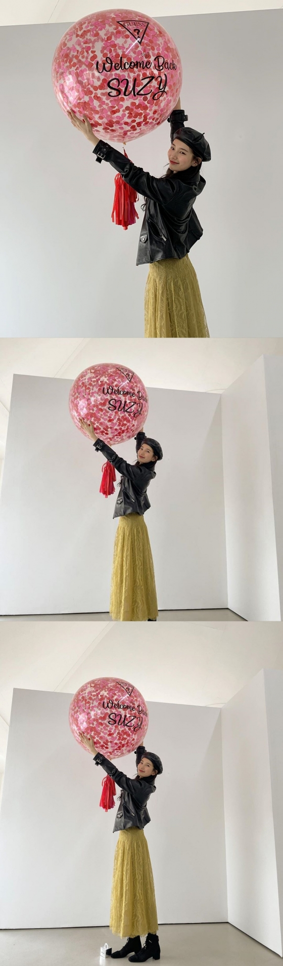 이어 공개한 사진 속 수지는 노란색 롱스커트에 가죽 재킷과 베레모로 스타일리쉬한 패션 센스를 보였다. 수지는 "돌아온 걸 환영해요 수지(Welcome Back SUZY)"라고 쓰여있는 큰 풍선을 들고 포즈를 취하고 있다.