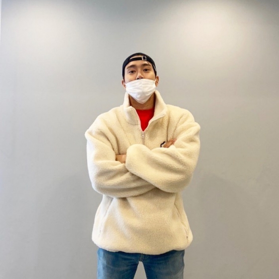공개된 사진 속 최시원은 하얀색 마스크를 끼고 팔짱을 끼고 있다. 최시원이 입고 있는 플리스는 슬리피가 디자인한 제품이다.