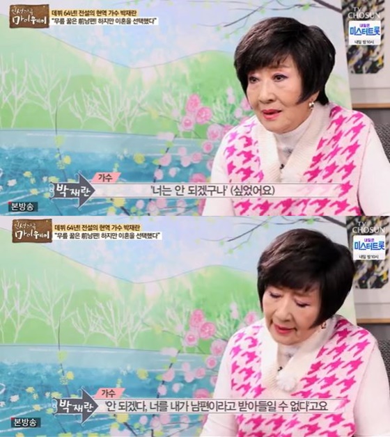 그러면서 박재란은 "자식이 2명 있어서 끝까지 살려고 했다"며 "그 당시 명동 다방에 마담이 있는데 전 남편과 마담이 홍콩으로 도망가려고 했다. 그래서 '너는 안 되겠구나' 싶었다. 자신 있게 이야기할 수 있다. '안되겠다. 너를 내가 남편이라고 받아들일 수 없다'고 느꼈다"며 "남편이 무릎을 꿇고 '하늘이 두 쪽 나도 내 맘이 변치 않을 것 같았다'고 했다. 그래서 내가 '변했을 때는 끝난거다'라고 말한 것이 마지막이다"고 털어놓았다.
