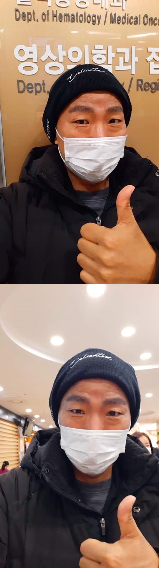 공개된 사진 속 김철민은 비니와 마스크를 쓰고 병원에서 엄지손가락을 치켜들고 있다. 밝아진 표정이 눈에 띈다.