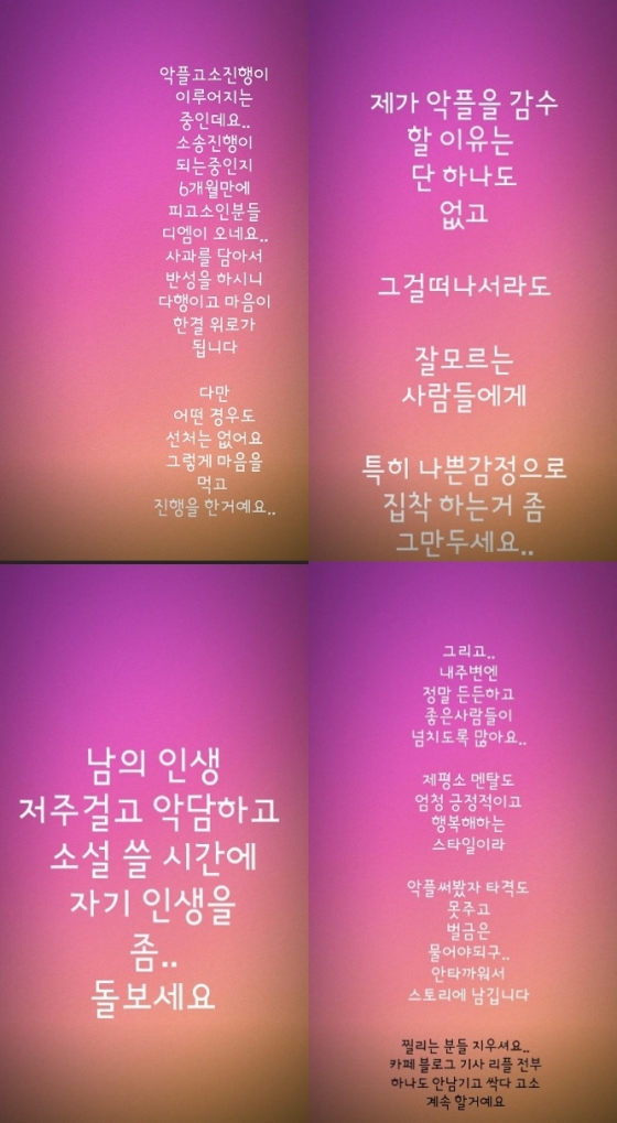 또 "내가 악플을 감수할 이유는 단 하나도 없다. 그걸 떠나서라도, 잘 모르는 사람에게 나쁜 감정으로 집착하는 거 그만둬라. 남의 인생 저주 걸고 악담하고 소설 쓸 시간에 자기 인생을 좀 돌아보라"며 일침을 가했다.