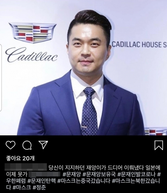 함께 공개된 사진에는 악플러가 정준의 일본 불매 운동을 언급하며 "당신이 지지하던 재앙이(문재인 대통령을 비하한 단어)가 드디어 이뤄냈다. 일본에 이제 못 간다"고 쓴 게시글이 담겼다.