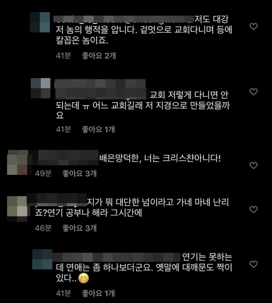 해당 게시글에 악플러들은 "겉멋으로 교회 다니며 등에 칼 꼽은 놈", "연기는 못하는 데 연애는 좀 하나보다", "연기 공부나 해라" 등의 댓글을 남기며 비난했다.