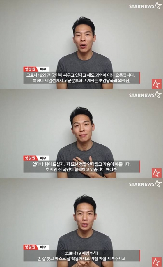 배우 양경원이 신종 코로나 바이러스 감염증(코로나19) 확산에 고군분투하는 이들을 위해 응원의 메시지를 전했다.
