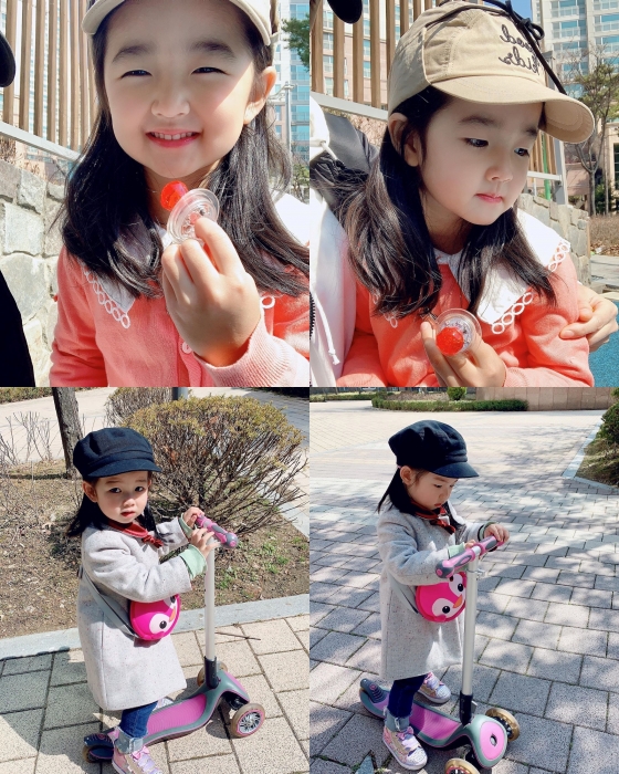하은 양은 자기 몸만한 킥보드를 타고 있다. 앙증맞은 캐릭터 가방이 귀여움을 더했다.