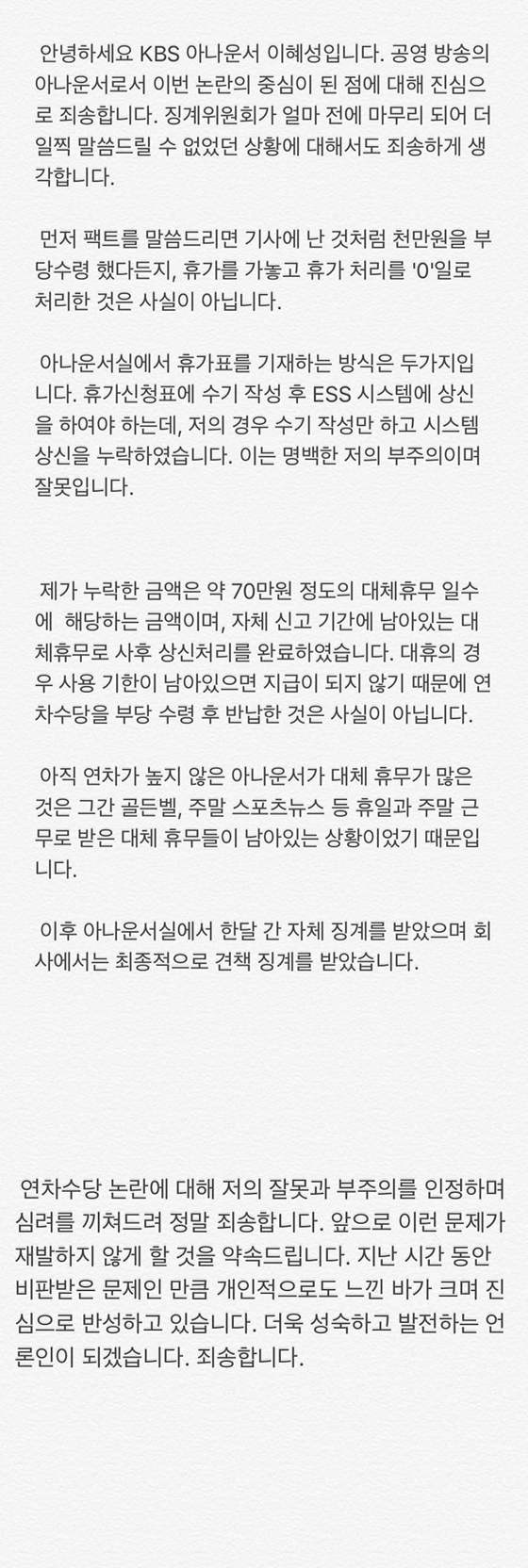 이혜성 아나운서는 11일 자신의 인스타그램에 지난해 논란이 된 연차 보상 수당 부당수령과 관련해 "공영 방송의 아나운서로서 이번 논란의 중심이 된 점에 대해 진심으로 죄송합니다"고 시작하는 글을 남겼다.