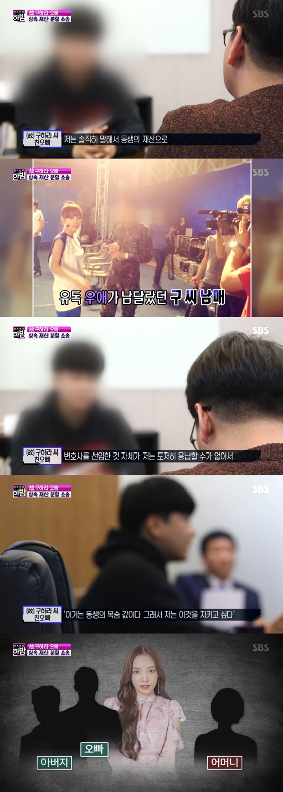 또한 구하라의 오빠는 친모에게 동생이 남긴 유산을 넘기고 싶지 않다는 뜻을 확실히 했다. 그는 "아버지한테 이야기 했다. '이거는 동생 목숨 값이다. (자녀를) 버린 사람이 동생의 목숨 값을 챙겨가도 되겠냐'고 했다"고. 구하라의 오빠는 아버지의 상속권리를 넘겨 받아 소송을 하게 됐다.