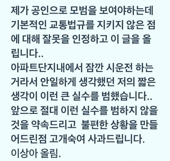 이상아는 사과문을 통해 "제가 공인으로 모범을 보여야 하는데 기본적인 교통법규를 지키지 않은 점에 대해 잘 못을 인정하고 이 글을 올립니다"고 했다. 이어 "아파트단지 내에서 잠깐 시운전 하는 거라서 안일하게 생각했던 저의 짧은 생각이 이런 큰 실수를 범했습니다"고 밝혔다.