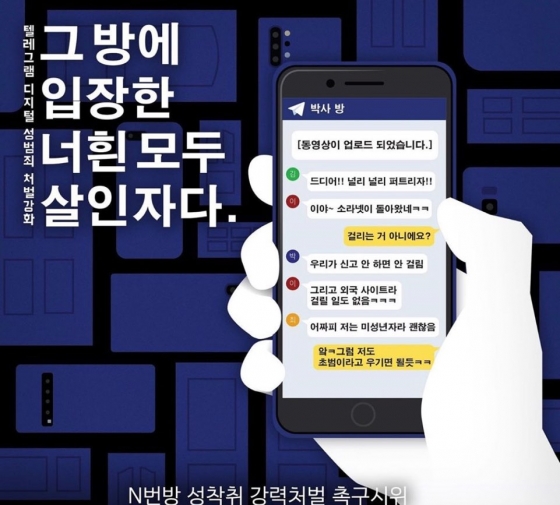 사진에는 '텔레그램 디지털 성범죄 처벌 강화. 그 방에 입장한 너흰 모두 살인자다'라는 문구가 적혀있다. 사진 하단에는 'n번방 성착취 강력처벌 촉구시위'라는 문구도 있다.