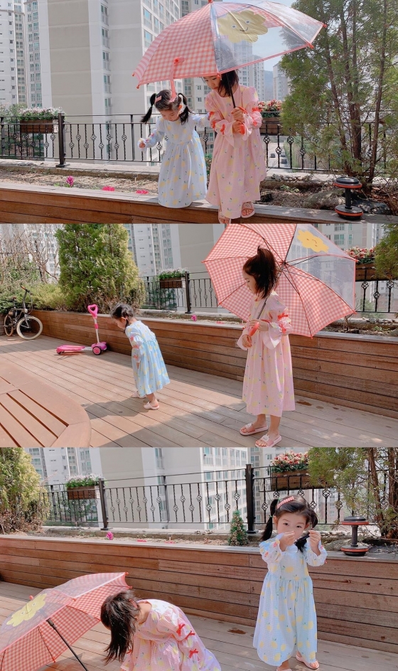 공개된 사진 속 소이현-인교진 부부의 딸 하은, 소은 양은 과일 그림이 그려져 있는 원피스를 입고 있다. 하은 양은 소은 양과 함께 우산을 쓰고 있다. 자매는 테라스 화단에서 뛰는 등 역동적으로 놀고 있다.