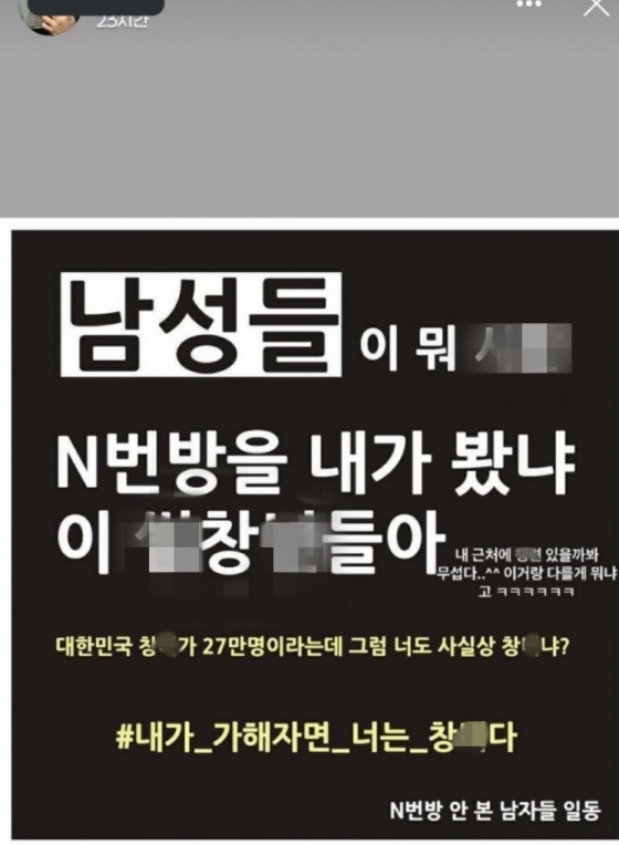 김유빈은 지난 24일 자신의 페이스북 스토리에 '남성들이 뭐 XX. N번방을 내가 봤냐 이 X창X들아. 대한민국 창X가 27만 명이라는데 그럼 너도 사실상 창X냐? #내가_가해자면_너는_창X다"라는 글을 공유한 후 "'내 근처에 창X 있을까 봐 무섭다' 이거랑 다를게 뭐냐고"라는 글을 올렸다.
