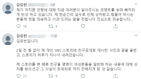 25일 김유빈은 자신의 트위터에 "2일 전 철없이 제 개인 SNS 스토리에 친구 공개로 게시한 사진과 글을 올렸고, 스토리가 하루가 지나서 내려갔다. 제 스토리를 본 페북 친구들 몇 명이 여성분들을 일반화하는 내용에 대해 상처를 받으셨고, 그 사실이 트위터로 까지 전해지게 된 것 같다"라고 글을 작성했다.