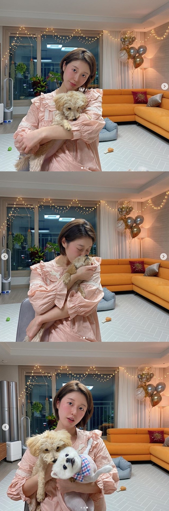 공개된 사진 속에는 강아지를 품에 안고 카메라를 응시하는 나비의 모습이 담겨있다. 나비는 잠옷을 입은 채 편안하고 사랑스러운 분위기를 자아냈다. 또 조명과 풍선으로 꾸민 나비의 신혼집이 많은 네티즌들의 시선을 사로잡았다.