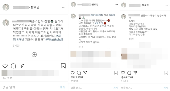 이후 "2010 #2012 지금 #2020. 仁 어질 인 아니라 참을 인이다. 나도 자유발언권 #헬조선. 국민으로서 인권의 권리 이제 누리며 살겠다. 내 삶이니까 내 인생은 내가 알아서 지금이 IMF보다도 더 힘들어도 그때보다 더 지금 더 뭐든 해서라도 살아서 버티고 이기고 살거다"라는 글을 추가로 게재했다.