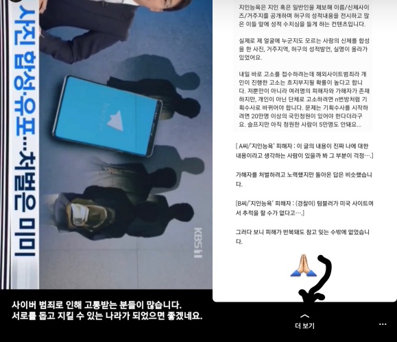 김보라는 30일 자신의 인스타그램 스토리에 "사이버 범죄로 고통받는 분들이 많습니다. 서로를 돕고 지킬 수 있는 나라가 되었으면 좋겠네요"라는 글과 함께 두 장의 사진을 게재했다.