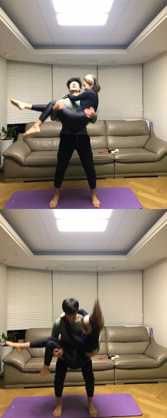 공개된 사진 속 김재우는 아내를 안고 운동을 하고 있다. 화목해 보이는 두 부부의 모습이 훈훈함을 자아낸다.