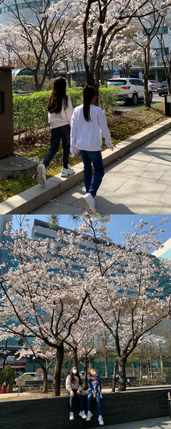 전미라는 아이들과 함께 길거리에 피어 있는 벚꽃을 구경하고 있다. 단란한 모녀의 모습이 훈훈함을 자아낸다.