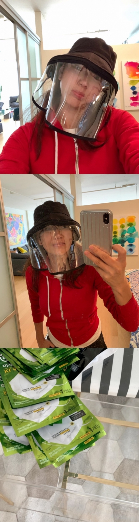 공개된 영상 속에는 선물로 받은 마스크 여러 개가 담겨 있다. 이어 윤현숙은 앞이 비닐로 쌓여 있는 일명 '코로나 모자'를 쓰고 환하게 미소 짓고 있다.