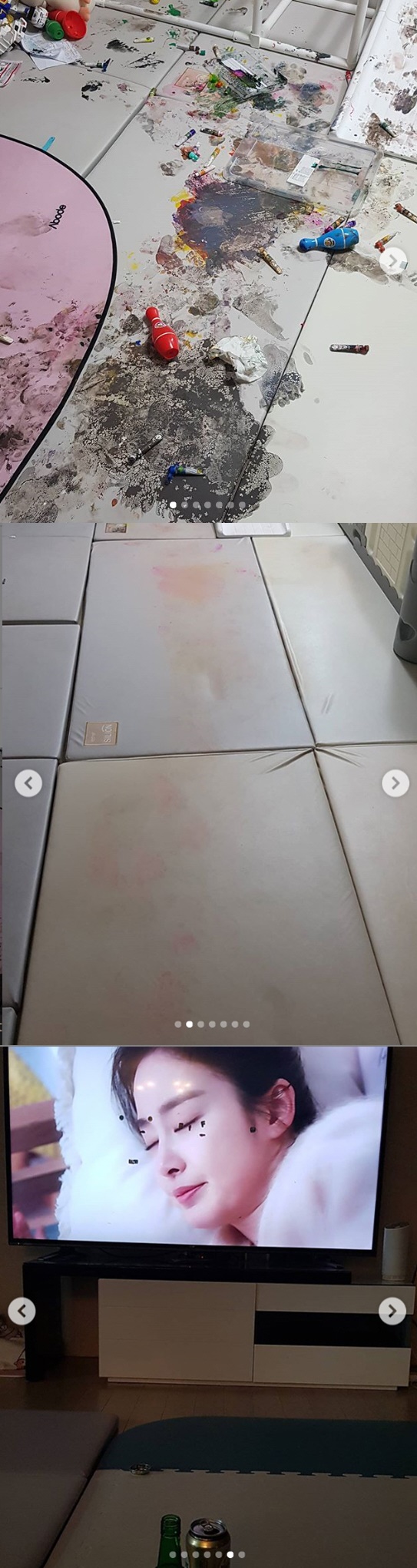 공개된 사진 속에는 세 아들이 물감으로 색칠한 매트와 스티커가 붙여진 TV가 담겨 있다. 아수라장이 된 집을 치우는 정주리의 고단함이 느껴진다.
