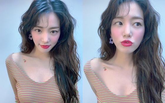핑크빛이 강조된 메이크업은 이유비의 화사한 미소를 더욱 돋보이게 만들고 있다. 특히 한쪽 쇄골에 위치한 채리 타투가 인상 적이다.