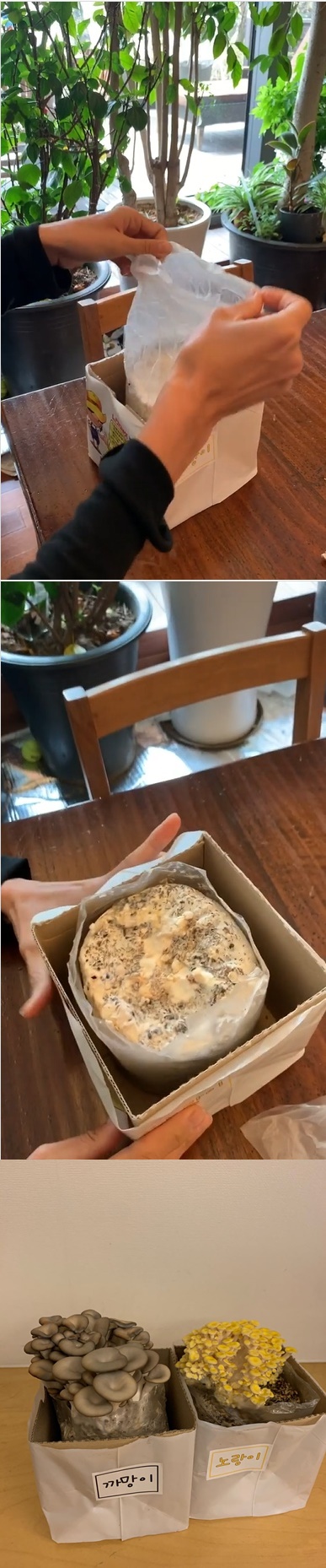 전미라는 느타리 버섯을 받은 후 박스를 개봉한 뒤 물을 줬다. 후 자라난 검은색, 노란색 느타리버섯을 재배한 것으로 보인다.