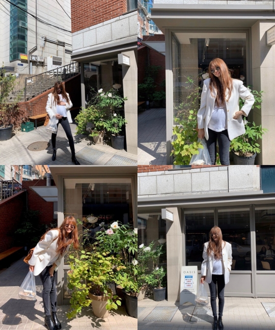 사진 속 양미라는 길고 늘씬한 팔다리를 자랑하고 있다. 임신 중임에도 완벽한 몸매를 선보인다. 볼록 나온 배만 아니면 임신한 것을 아무도 모를 정도다.