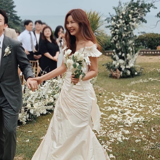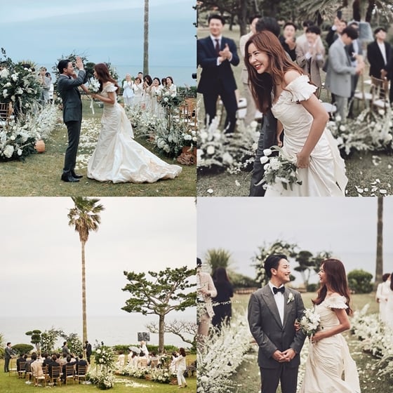 공개된 사진 속에는 제주도에서 본식을 진행하는 김준희의 모습이 담겼다. 김준희는 바다가 보이는 야외 예식장에서 행복한 듯 밝게 웃고 있다.