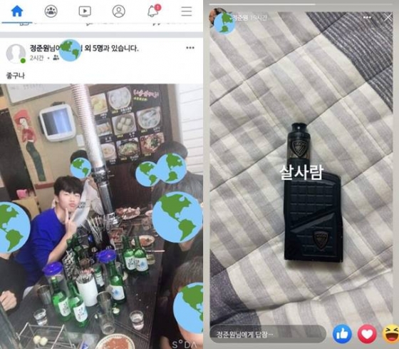 이날 온라인 커뮤니티에서는 정준원으로 보이는 청소년이 친구들과 함께 소주를 마시는 사진, 단체로 담배를 피우는 사진이 공개됐다. 또 정준원이란 이름의 계정에선 전자담배 사진을 놓고 "살사람"이라는 글이 올라와 있었다. 정준원의 SNS는 현재 비공개 상태다.