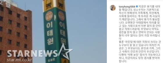 홍석천은 "물론 ‘아웃팅’에 대한 걱정이 크다는 건 누구보다 잘 알고 있습니다 하지만 지금은 그 무엇보다도 본인과 가족, 그리고 사회의 건강과 안전이 우선입니다. 다행히 ‘익명 보장’ 검사가 가능하다고 하니, 지금이라도 당장 검사를 받아야 합니다"라고 말했다.