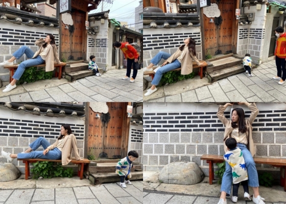 사진 속 이미도는 현란한 포즈를 취하고 있다. 이미도 옆에는 아들 도형이가 있다. 한 프레임 안에 있지만 각기 다른 행동을 하는 모자의 모습은 재미를 더한다.