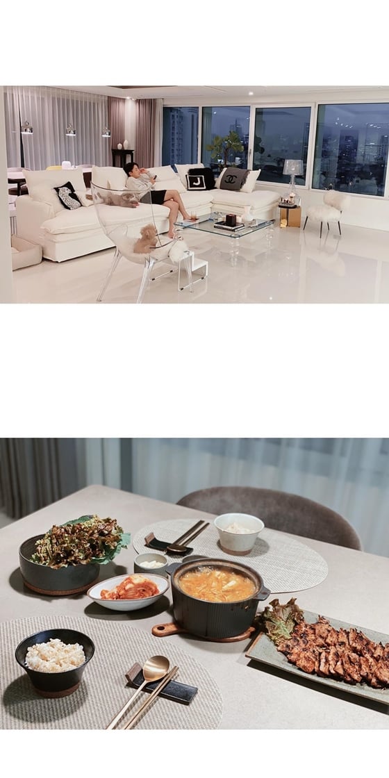 공개된 사진 속에는 드넓은 거실에서 편안히 휴식을 취하는 김준희의 남편의 모습이 담겼다. 모던하고 고급스러운 인테리어가 눈에 띈다. 또 다른 사진 속에는 김준희 부부의 정갈한 저녁 메뉴가 담겨있다.