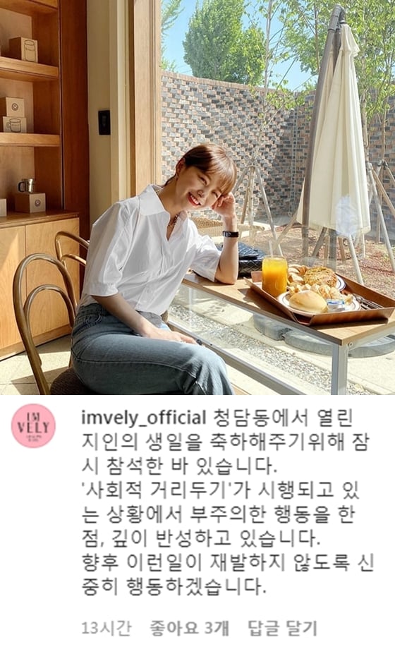 앞서 임블리는 자신의 개인 인스타그램 댓글을 통해서도 사과의 뜻을 전했다. 그는 한 네티즌의 "언니 클럽 기사 사실이에요?"라는 댓글에 "클럽은 아니구요, 청담동 브런치 카페에 지인의 생일을 축하해주기 위해 잠시 들렀어요. '사회적 거리두기'가 시행되는 상황에서 부주의한 행동을 한 점 깊이 반성하고 있습니다"고 답글을 달았다. 이후 해당 인스타그램 계정은 비공개된 상태다.