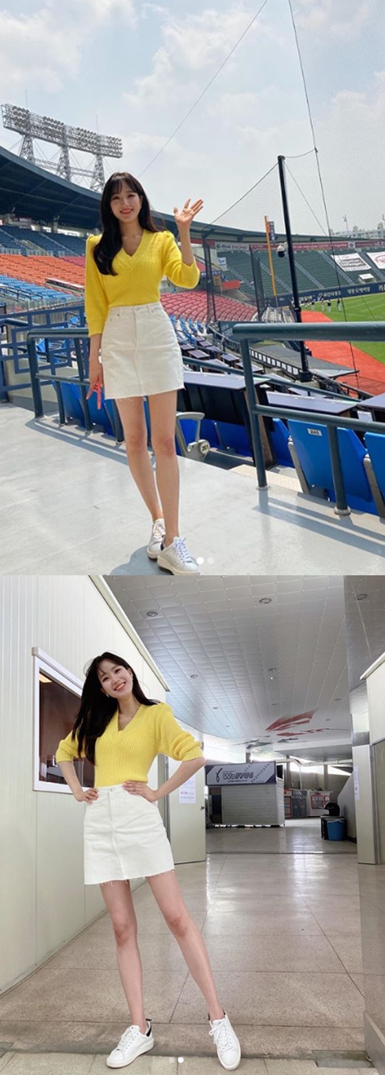 공개된 사진 속에는 야구장에서 노란색 옷과 짧은 치마를 입고 상큼한 매력을 발산하는 주시은 아나운서의 모습이 담겨있다. 주시은 아나운서는 길고 마른 다리를 자랑하며 눈길을 끌었다.