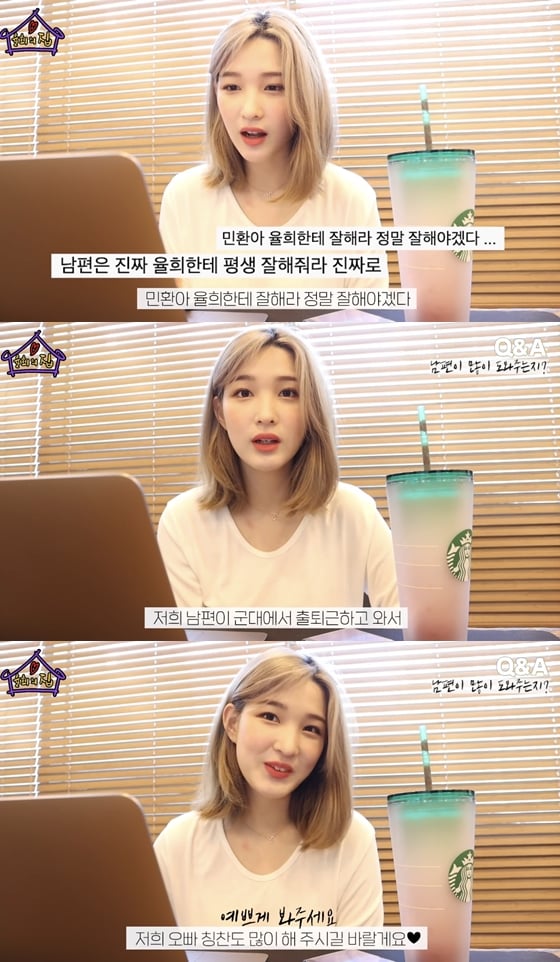 율희는 구독자들이 남긴 댓글 중 "최민환은 율희한테 진짜 잘해줘야 한다. 평생 잘해야 한다"라는 댓글에 "남편이 군대에서 퇴근하고 와서 집에서 다시 출근한다. 자는 모습 보면 안쓰러울 정도로 잘해주고 있으니 걱정하지 않아도 된다"고 답변했다. 또 "걱정해주셔서 감사하지만 저희 오빠 칭찬도 많이 해주시길 바란다"며 최민환에 대한 애정을 드러냈다.