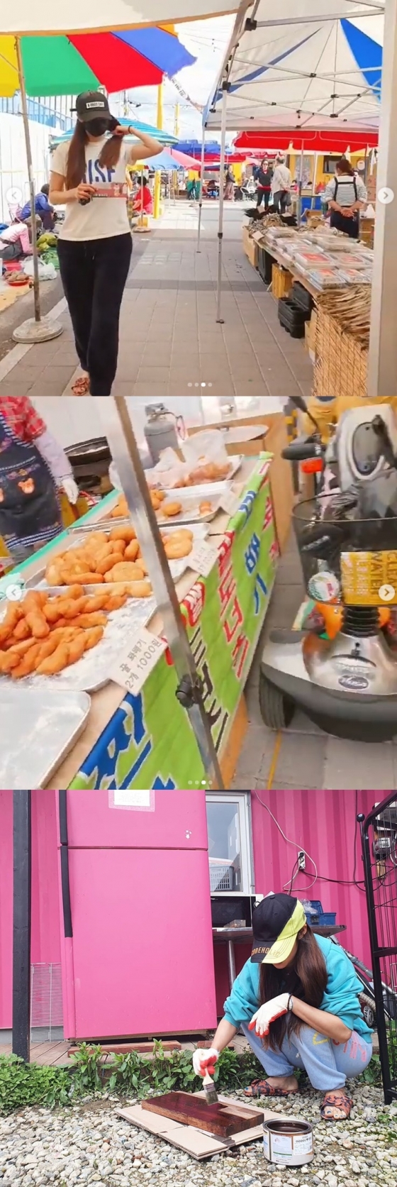 신발도 안 갈아신고.. #페인트칠 #니스칠 #가평5일장 #지압 슬리퍼 #여배우의 일상 #가평 주민 #거지 패션"이라는 글과 함께 동영상과 사진을 게재했다.