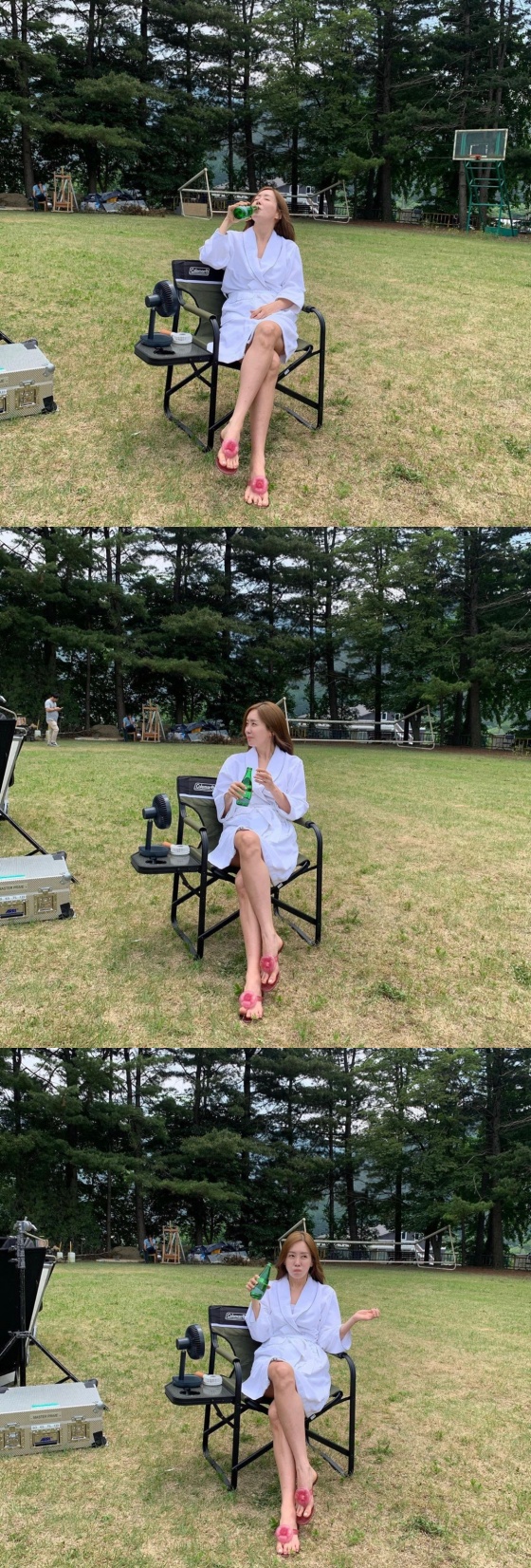 사진 속 김정은은 촬영 중간 휴식을 취하고 있다. 샤워 가운을 입고 있는 김정은의 청순한 얼굴과 각선미가 눈에 띈다.