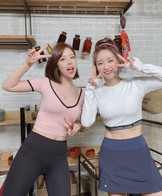 공개된 사진 속에는 크롭티와 레깅스를 입은 채 포즈를 취하고 있는 김해나의 모습이 담겨있다. 그의 옆에는 아나운서 허송연이 함께였다.