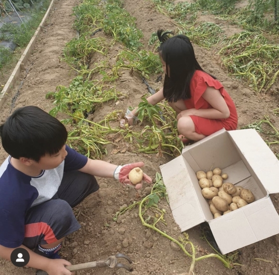 사진은 이영애의 쌍둥이 남매가 감자를 수확하고 있는 모습이다. 화려한 탑배우의 반전 일상이 돋보인다.
